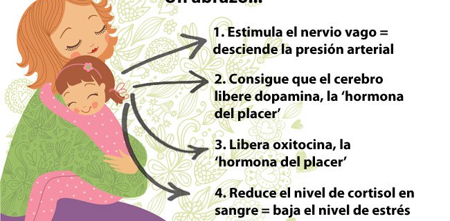 - Libera dopamina, la hormona del placer:Los abrazos liberan un neurotransmisor (un mensajero químico del cerebro) llamado dopamina, que ejerce un gran poder de alivio contra el estrés. La dopamina también se le conoce como la ‘hormona del placer’. También está relacionada con la creatividad y la capacidad de relacionarse o sociabilizar con los demás.